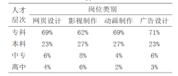 从人才层次上看,数字媒体技术同其他专业一样,市场需求同样涵盖各个学历层次,主要有高中层次、中专层次、专科层次、本科层次等。网页美工、影视制作、动画制作、广告设计各类行业人才层次比例统计如表2所示(数据来源于职友集)。按网页美工、影视制作、动画制作、广告设计相关的职位进行统计,各类行业岗位初入职薪酬待遇统计如表3所示(数据来源于职友集)。由表3数据可以看出,该专业从业薪酬幅度为2000~20000元/月,其中各类行业占比最高为:网页设计类3000~4500元/月,为32.8%;影视制作类3000~4500元 / 月,为32.3%;动画制作类4500~6000元/月,为25.2%;广告设计类2000~3000元/月,为32.4%。平均薪酬分别为网页设计类5121元/月、影视制作类5262元 /月、动画制作类6121元/月、广告设计类4885元/月。